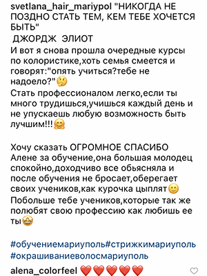 Меня зовут Афанасьева Алена, и я – колорист с более чем двенадцатилетним опытом работы. Для меня колористика – это не просто профессия, это то что меня вдохновляет! Еще с самого детства я мечтала о том, чтобы стать парикмахером, и когда мне исполнилось 18 лет, я получила соответствующее образование. Все эти годы я углубленно изучала мир колористики, и сейчас с уверенностью могу заявить, что каждый человек способен освоить этот искусство благодаря моему курсу. Мой курс – это не просто набор знаний, это возможность полностью погрузиться в мир цвета! Я разработала его так, чтобы даже те, кто начинает с нуля, могли освоить новую, высокооплачиваемую профессию уже сегодня. Все мои знания, опыт и наработки я вложила в этот курс, делая его максимально структурированным и доступным. И что особенно важно – после завершения курса я не бросаю вас на произвол судьбы. Я буду рядом в течение шести месяцев, поддерживая и направляя вас на пути к профессионализму. Моя цель – провести вас за руку от начинающего мастера до истинного профессионала! Представьте только, каким образом ваша жизнь изменится после прохождения моего курса! Колористика – это сфера, в которой всегда есть место для роста и развития. Это профессия, которая дает вам возможность самостоятельно управлять своим графиком и получать удовольствие от своей работы!