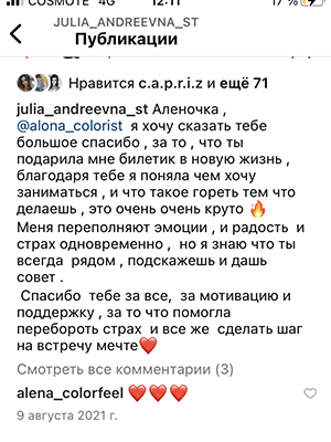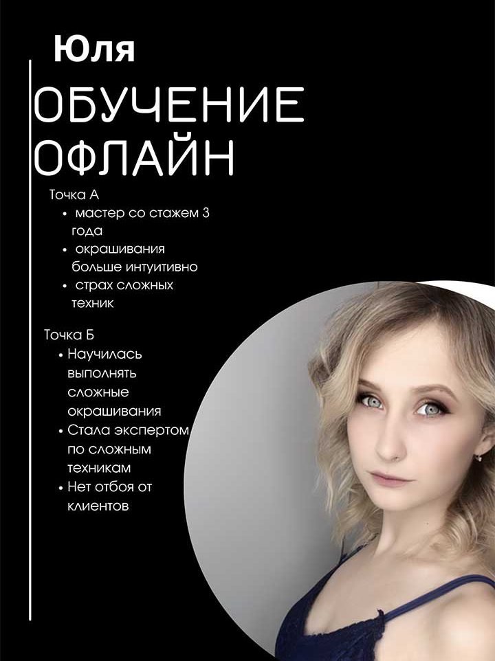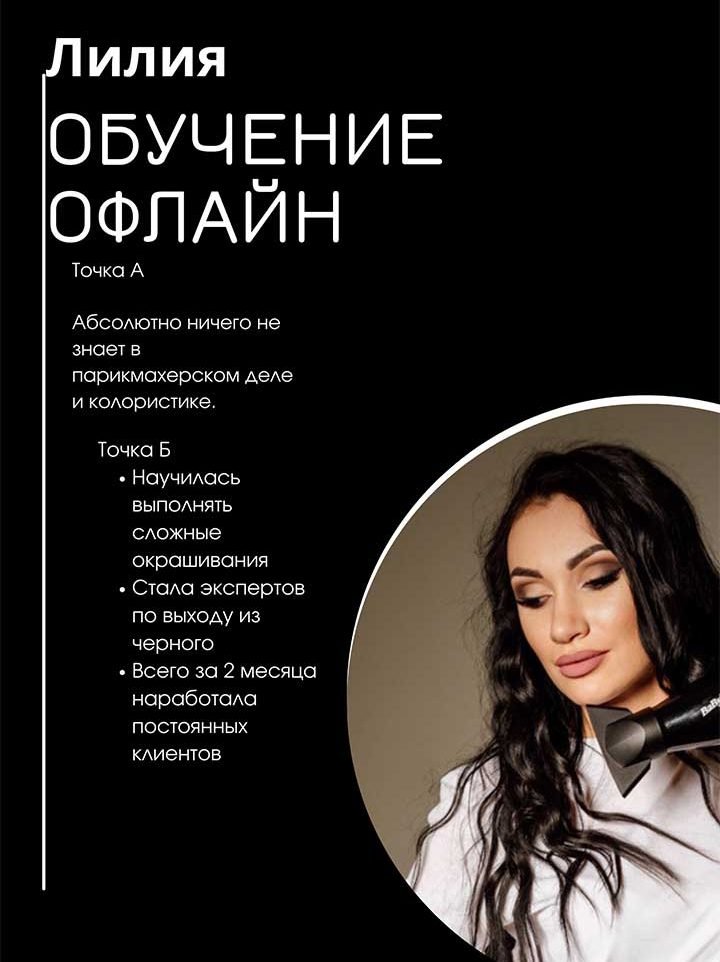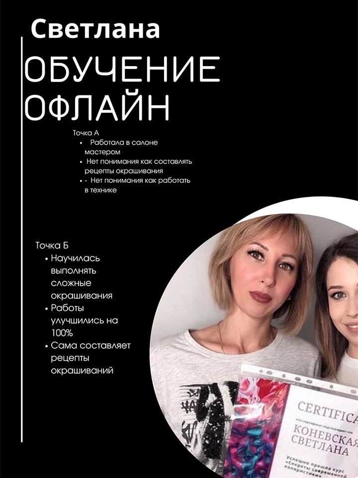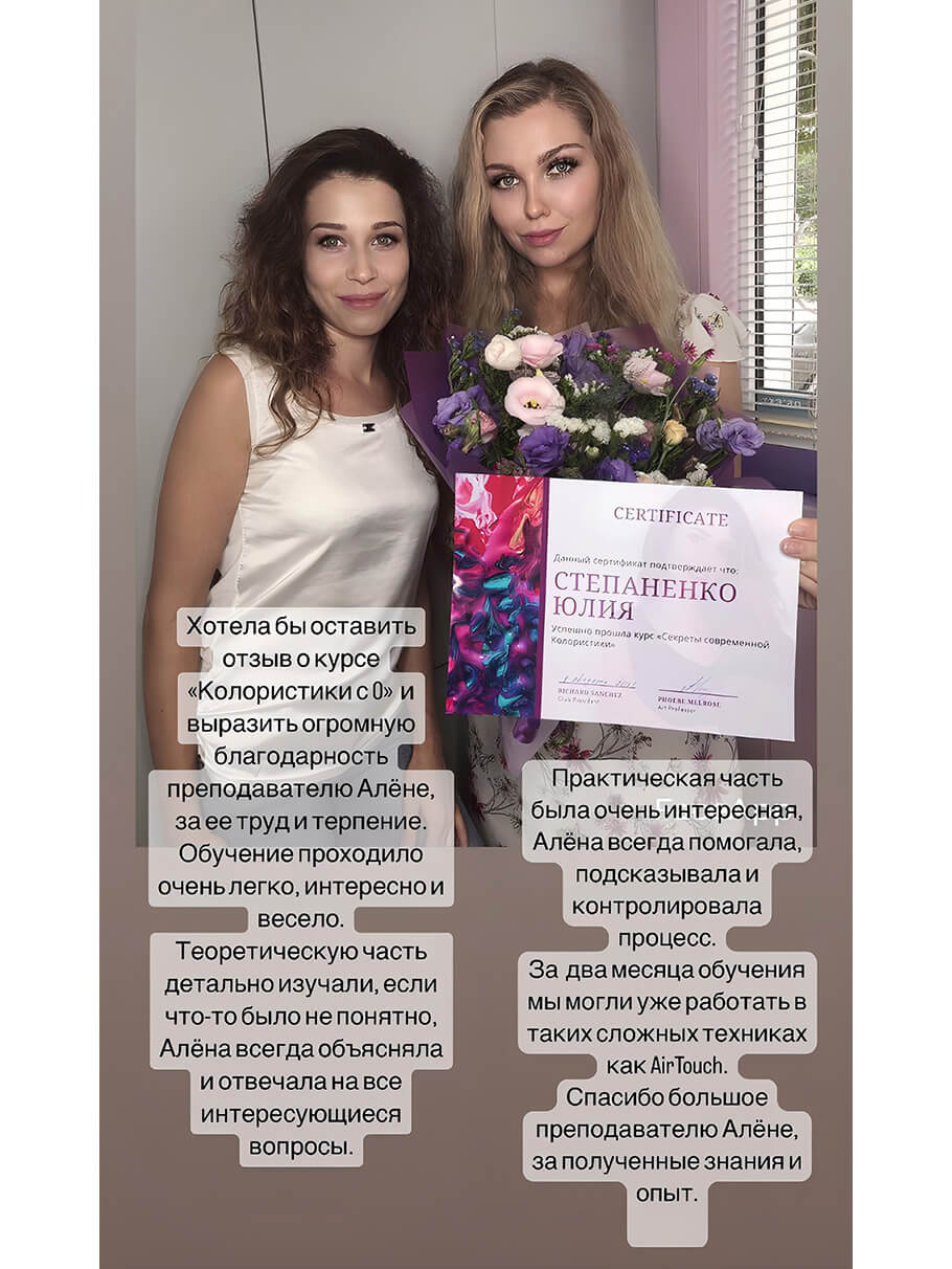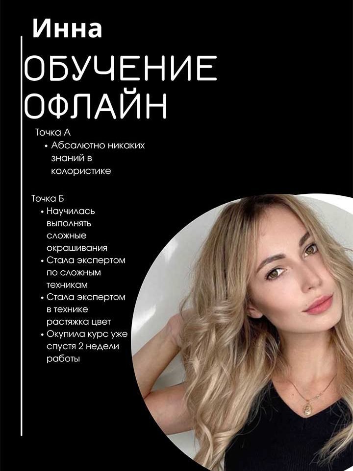 Не важно, являетесь ли вы новичком или опытным мастером, мой курс предоставляет вам все необходимые знания и навыки, чтобы успешно справляться с любыми запросами клиентов. Вы не будите больше испытывать стресс или сомнения – забирайте мой 12 летний опыт и откройте для себя увлекательный мир колористики.
